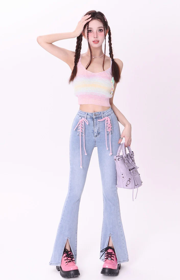 Bubblegum Rainbow Gradient Color Knit Cardigan Sling Short Camisole Cardigan Two Piece Set