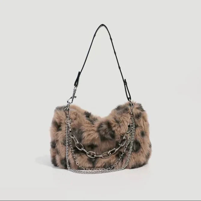 Plush Leopard Pattern Pink Brown White Shoulder Messenger Bag