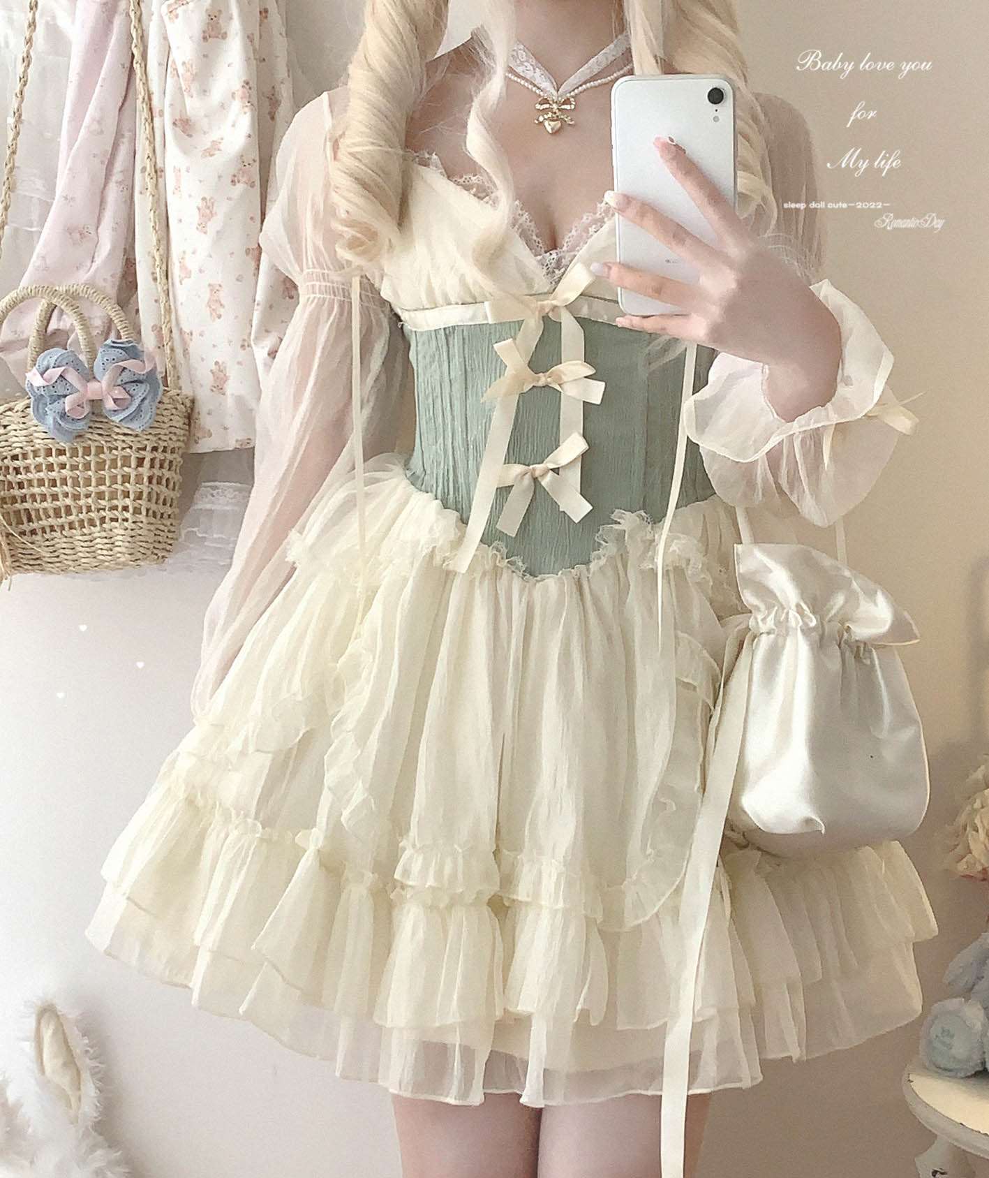 Dormir Doll Princess of Clouds and Mists Lace Bow Strap Dress & Cardigan Two Piece Set