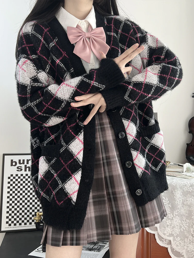 Blue White & Black Pink Diamond Argyle Pattern Cardigan