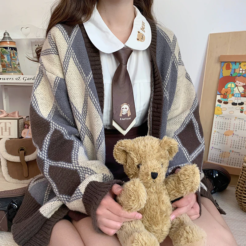 Rhombus Diamond Pattern Brown Cozy Autumn Winter Knit Cardigan