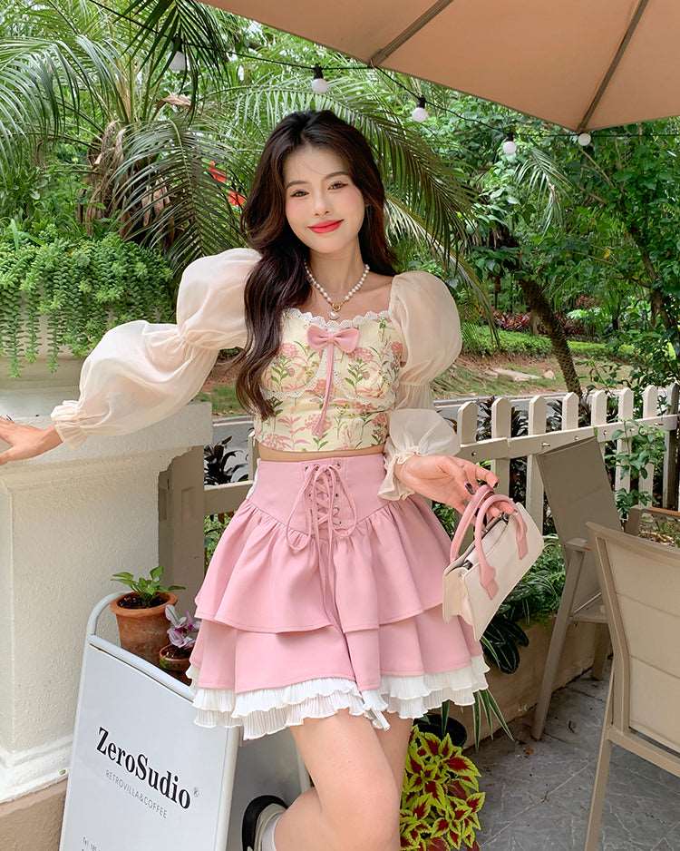 -70%Blue Angel Sweet Vintage Elegant Pink Floral Blouse Skirt Two Piece Set—